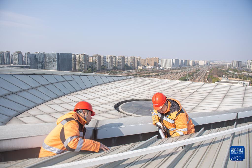 1月21日,杭州房建公寓段工人徐烜泱(右)與金一鳴在杭州東站屋面進(jìn)行巡檢。