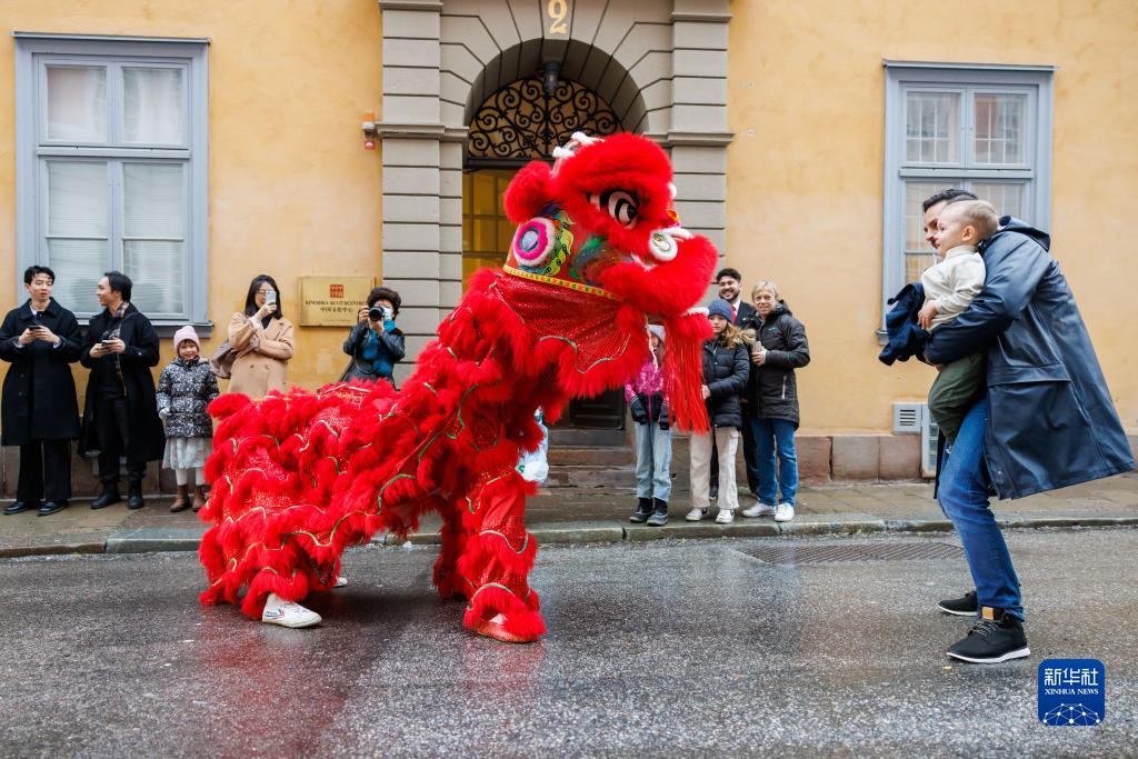 1月14日,人們在瑞典斯德哥爾摩中國文化中心外觀(guān)看舞獅。