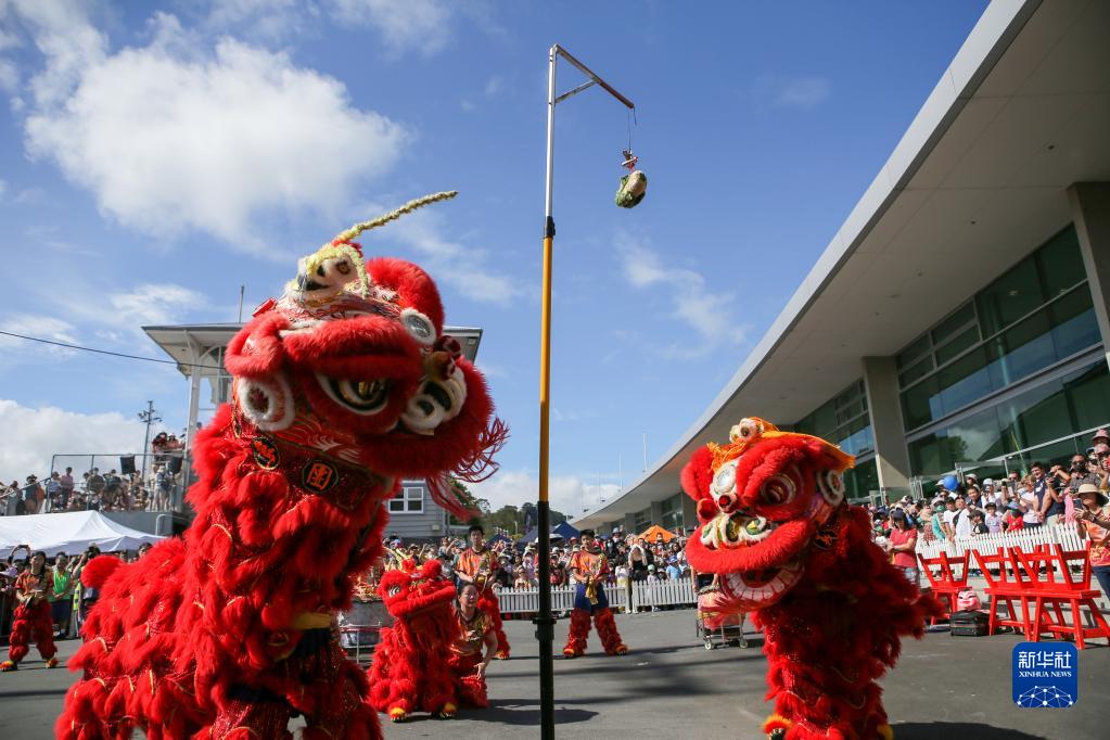 這是1月21日在新西蘭奧克蘭舉行的迎接中國農歷春節活動(dòng)上拍攝的舞獅表演。