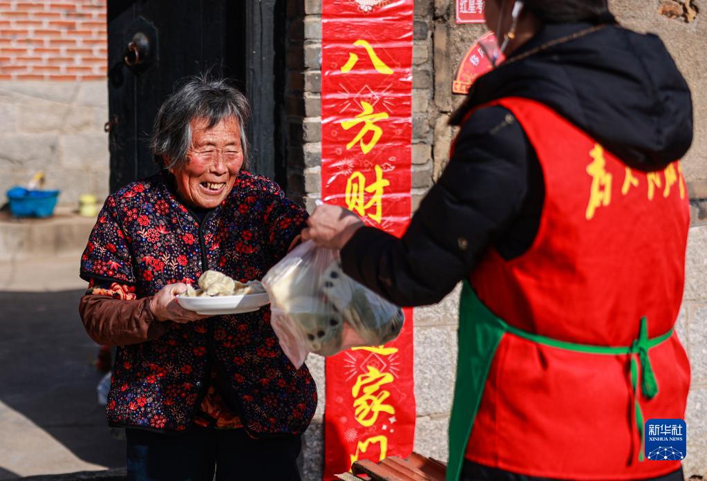 1月21日,在山東省榮成市夏莊鎮甲夼馬家村,志愿者為村里的老人送餃子和棗餑餑。
