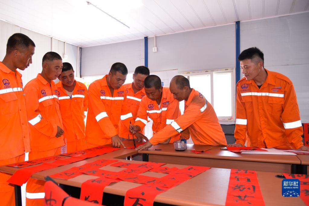 1月21日,在印度尼西亞勿加泗,中鐵電氣化局印尼雅萬(wàn)高鐵項目部勿加泗工區的員工們在一起寫(xiě)春聯(lián)。