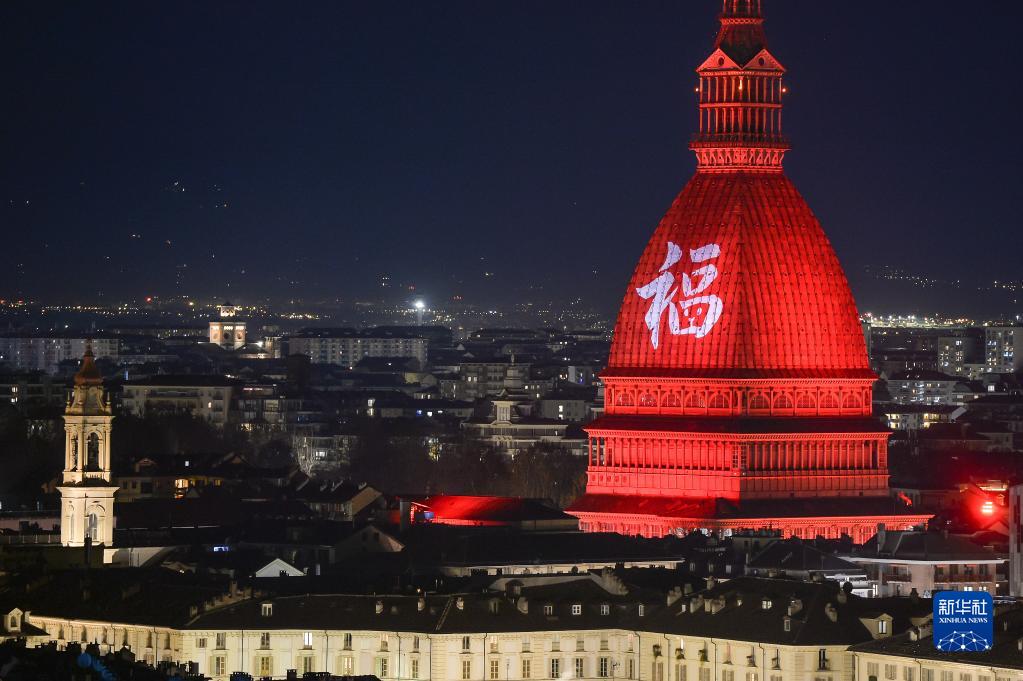 1月21日晚,意大利都靈的地標性建筑安托內利尖塔點(diǎn)亮“中國紅”和“?!?字,慶祝中國春節。
