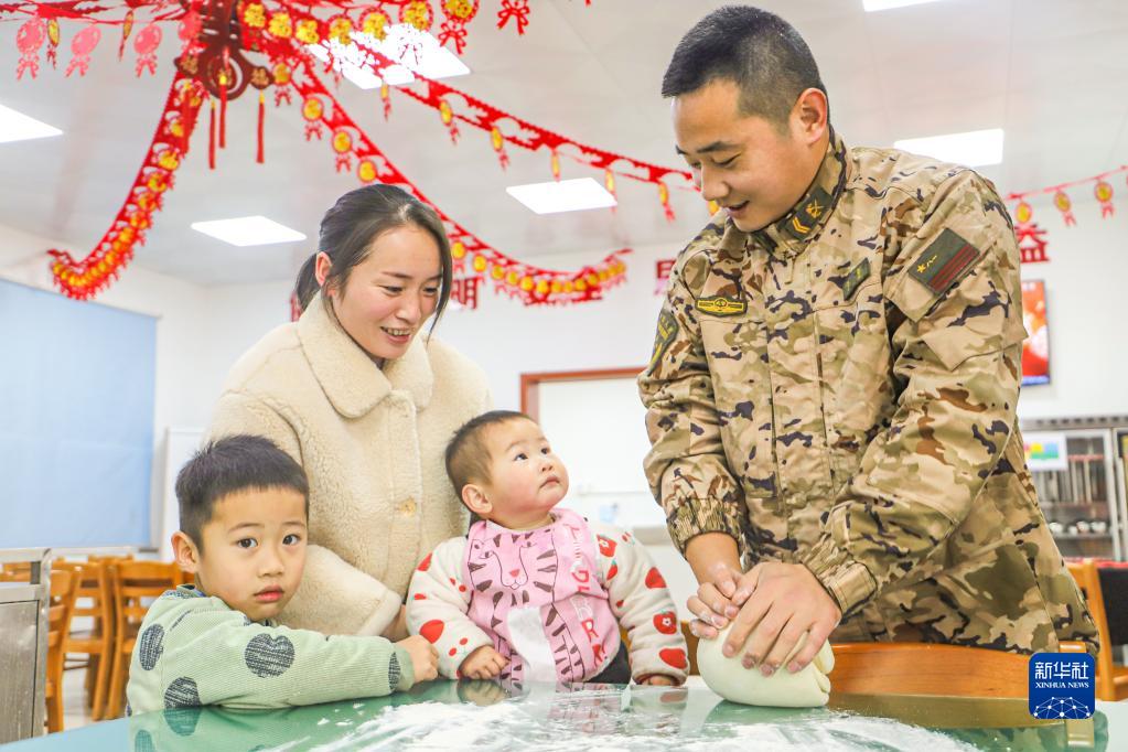 1月21日,武警河南總隊商丘支隊一名四期士官與來(lái)隊家屬一同包餃子,共度團圓年。