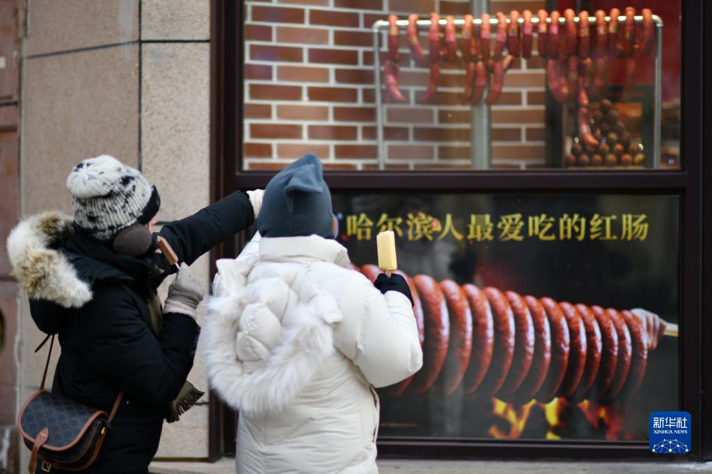 1月22日,在哈爾濱中央大街,游客在一家哈爾濱紅腸售賣(mài)店鋪前留影。
