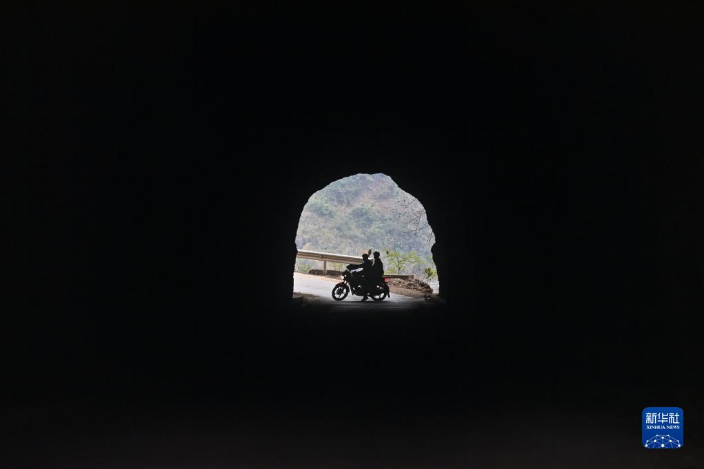 蒙宣任(左)和蒙宣汰騎摩托車(chē)經(jīng)過(guò)懸梯下方的隧道(2023年1月20日攝)。2014年,隧道打通、公路修通后,“天梯上學(xué)路”成為歷史。