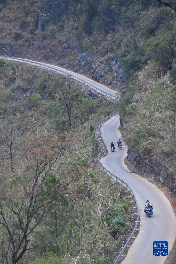 蒙宣汰(上右)和朋友騎摩托車(chē)回家(2023年1月20日攝)。曾經(jīng)上學(xué)必經(jīng)的山路,在2016年修通了水泥路。