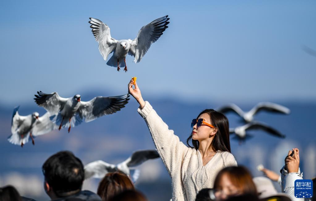 1月23日,游客在昆明市滇池海埂大壩上投喂紅嘴鷗。