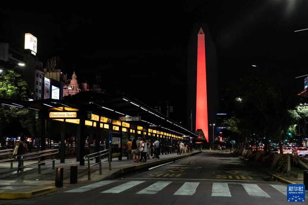 1月22日,阿根廷首都布宜諾斯艾利斯市中心的地標性建筑方尖碑點(diǎn)亮“中國紅”,慶祝中國春節。