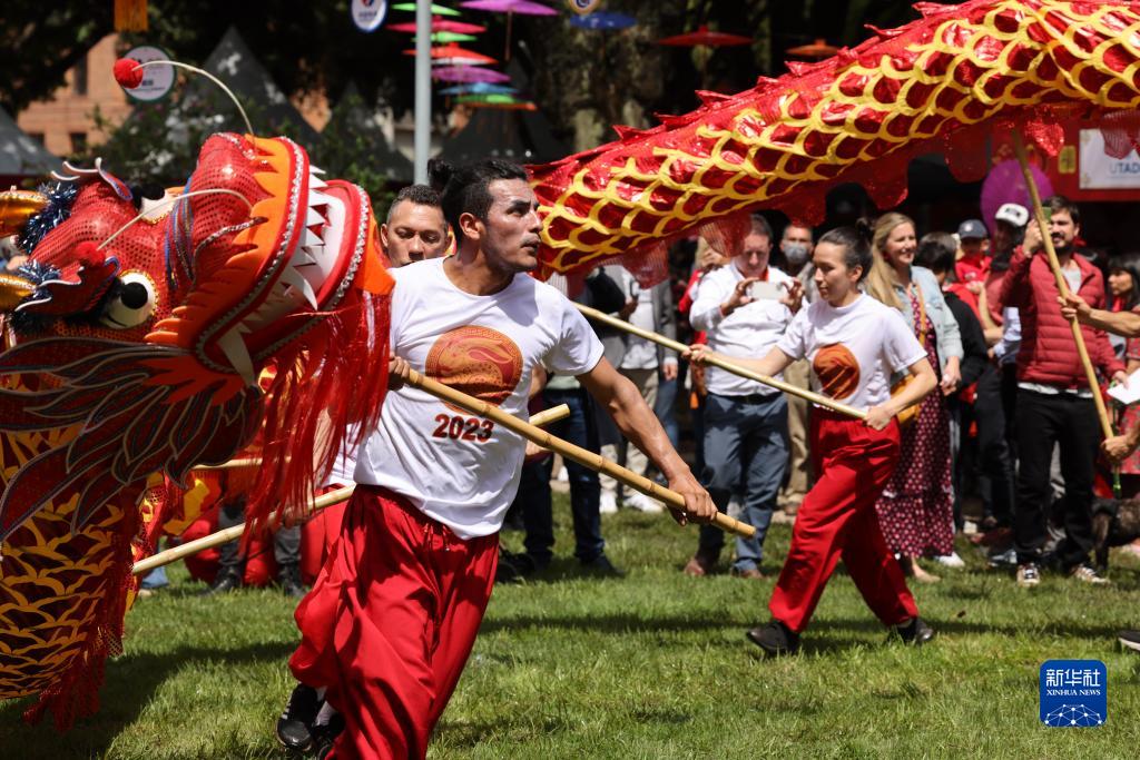 1月22日,在哥倫比亞首都波哥大市中心的93公園,演員表演舞龍。