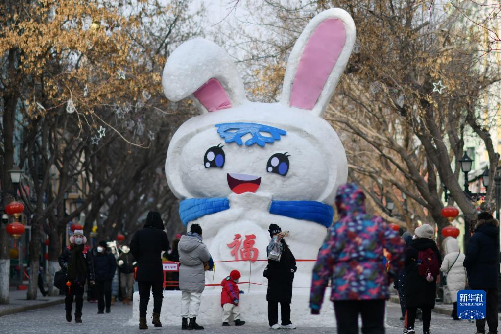 在哈爾濱中央大街,游客和兔子雪雕合影(1月22日攝)。