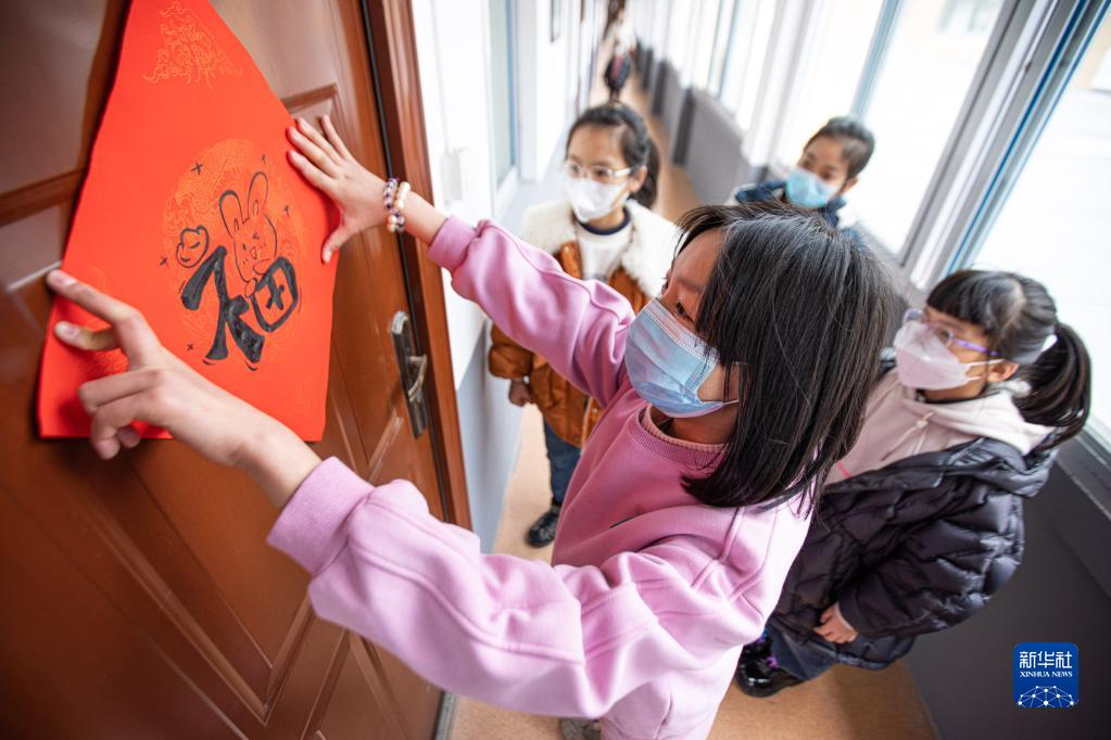 在浙江省溫嶺市大溪小學(xué),學(xué)生們在貼兔年創(chuàng )意福字(1月17日攝)。
