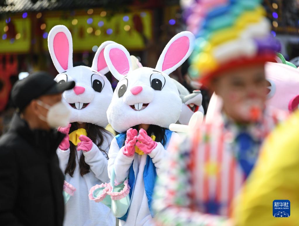 1月23日,在2023成都金沙太陽(yáng)節活動(dòng)現場(chǎng),裝扮成兔子造型的人偶和游客互動(dòng)。
