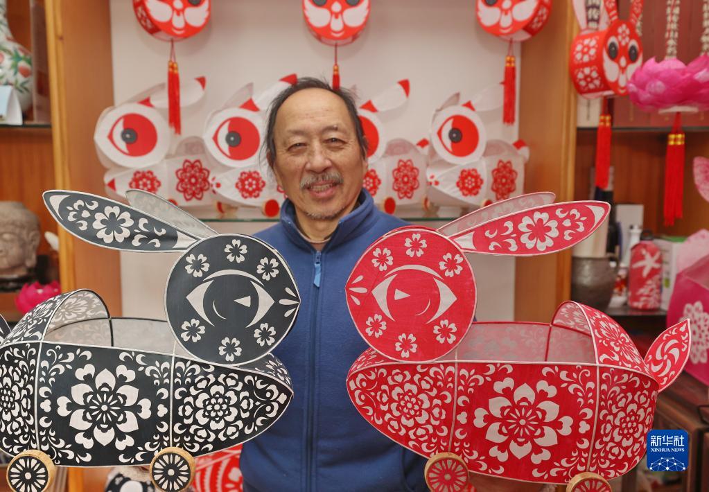 1月23日,南通燈彩手工藝人何麟強在南通市崇川區展示他制作的生肖兔花燈。