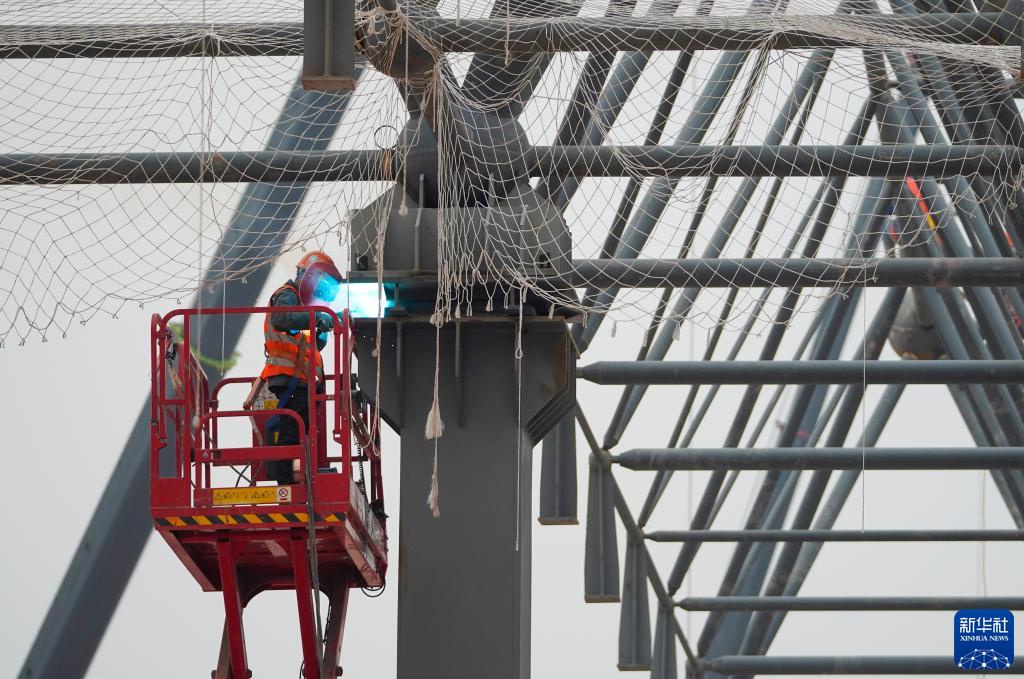 1月23日,在重慶兩江新區新能源汽車(chē)產(chǎn)業(yè)園基礎設施配套項目現場(chǎng),工人在進(jìn)行鋼結構網(wǎng)架拼裝后的焊接作業(yè)。