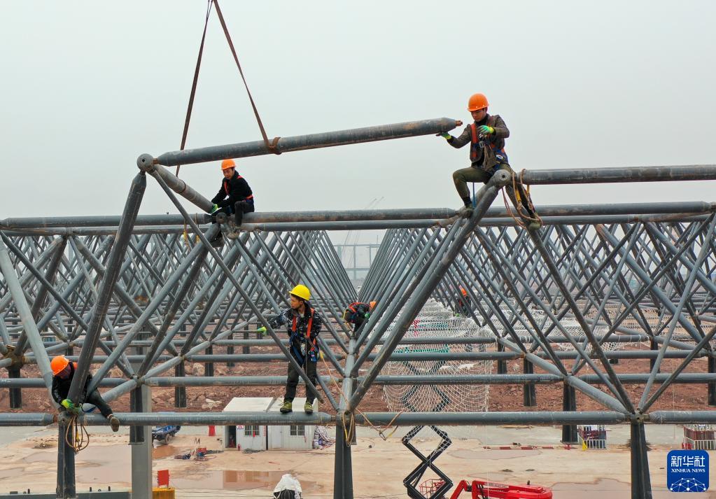 1月23日,在重慶兩江新區新能源汽車(chē)產(chǎn)業(yè)園基礎設施配套項目現場(chǎng),工人在進(jìn)行鋼結構施工作業(yè)(無(wú)人機照片)。