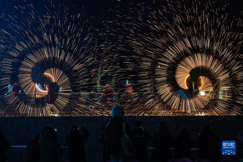 1月23日,觀(guān)眾在盱眙第一山歷史文化街區觀(guān)看打鐵花表演。