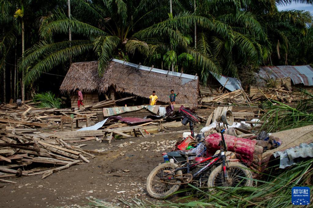1月23日,在印度尼西亞亞齊特區北亞齊地區,孩子們站在受損的房屋旁。