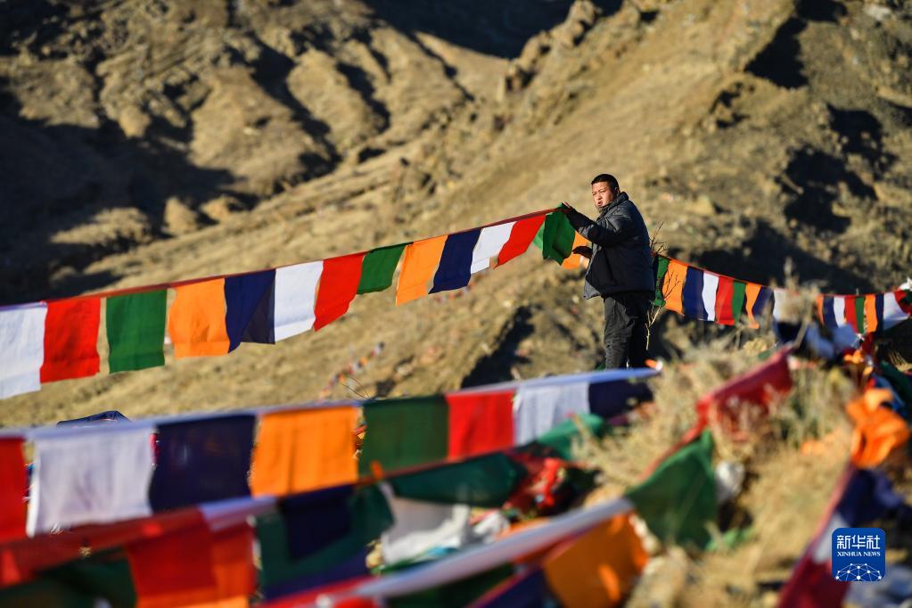 西藏日喀則地方藏歷農家新年期間,藏族群眾沿襲傳統,一大早就在山頂和自家屋頂上豎起新經(jīng)幡,祈愿新年風(fēng)調雨順、國泰民安。