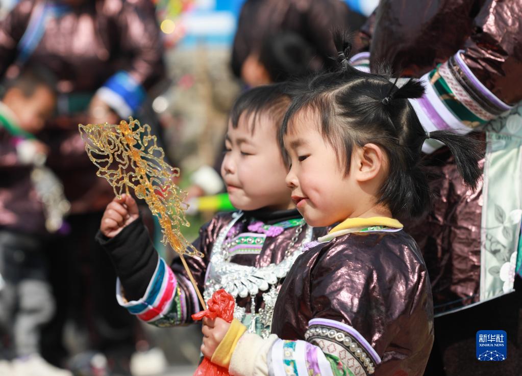 1月24日,在貴州省黔東南苗族侗族自治州從江縣剛邊壯族鄉銀平村,兩名小女孩在品嘗糖畫(huà)。