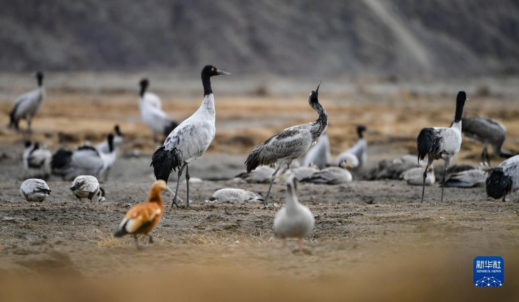 在西藏雅魯藏布江中游河谷黑頸鶴國家級自然保護區日喀則片區拉孜縣附近,大量越冬的黑頸鶴翩翩起舞,迎接春天的到來(lái)。
