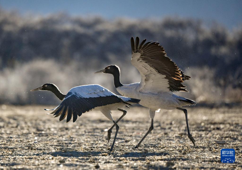 在西藏雅魯藏布江中游河谷黑頸鶴國家級自然保護區日喀則片區拉孜縣附近,大量越冬的黑頸鶴翩翩起舞,迎接春天的到來(lái)。