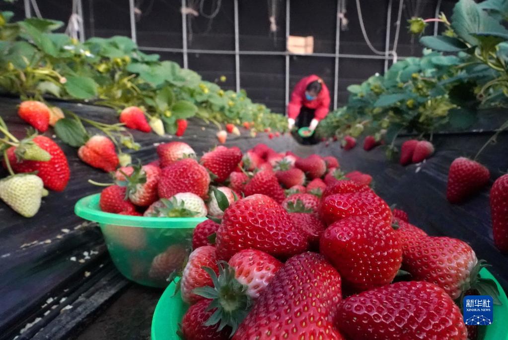 1月25日,河北省灤州市茨榆坨鎮的農民在大棚里采摘草莓。