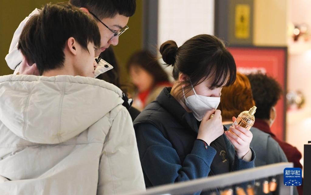 1月25日,游客在中免集團??谌赵聫V場(chǎng)免稅店選購免稅商品。