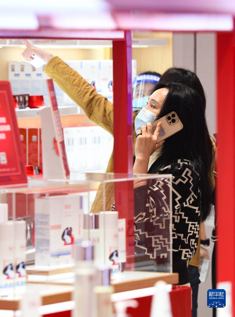 1月25日,游客在中免集團??谌赵聫V場(chǎng)免稅店選購免稅商品。