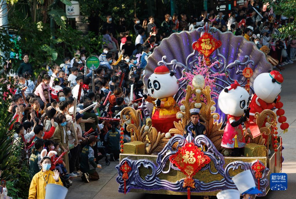 游客在廣州長(cháng)隆野生動(dòng)物世界觀(guān)看新年花車(chē)巡游(1月22日攝)。