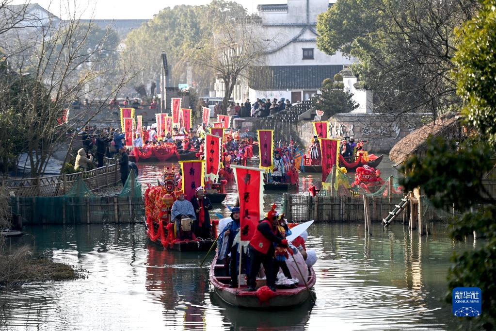 1月26日,在浙江省湖州市南潯區和孚鎮荻港村,載有200多位村民的24條漁船在水上古道巡游。