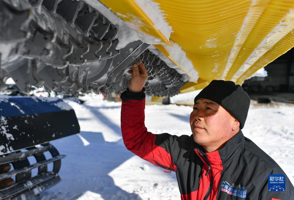 新疆絲綢之路國際度假區壓雪機駕駛員張金福在檢查機器上雪犁的磨損程度(1月25日攝)。他來(lái)自度假區周邊的七工村,和弟弟張幸福一起在這里上班。