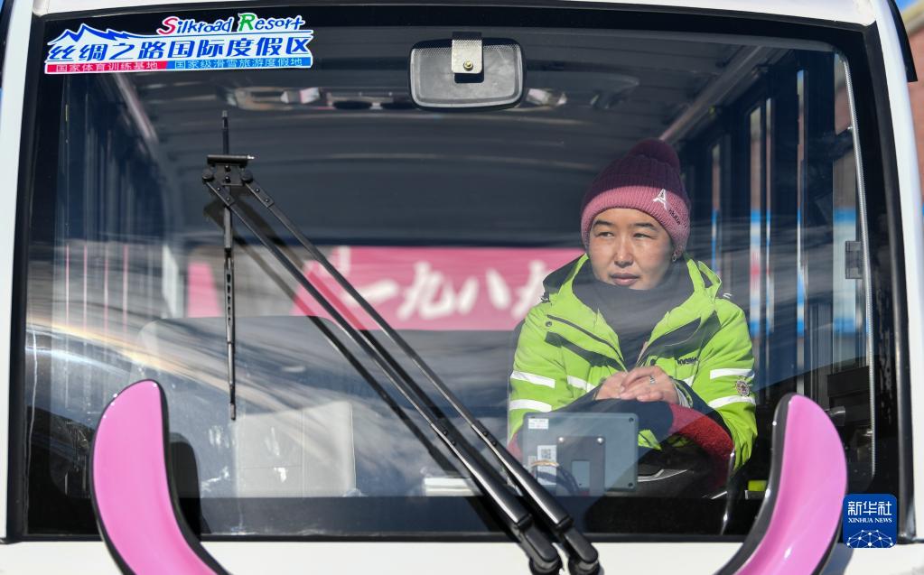 新疆絲綢之路國際度假區3號索道站至6號索道站區間車(chē)駕駛員阿曼古麗·阿里甫在站點(diǎn)等候游客上車(chē)(1月25日攝)。她來(lái)自度假區旁的東灣村,和丈夫一起在此工作。
