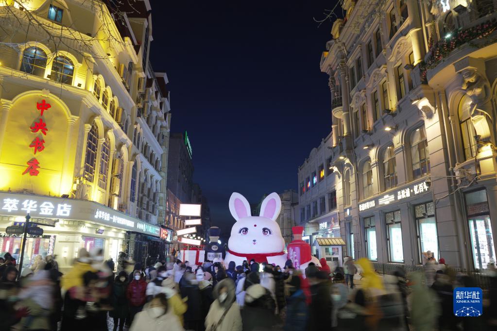 1月25日,游人在哈爾濱中央大街游玩。