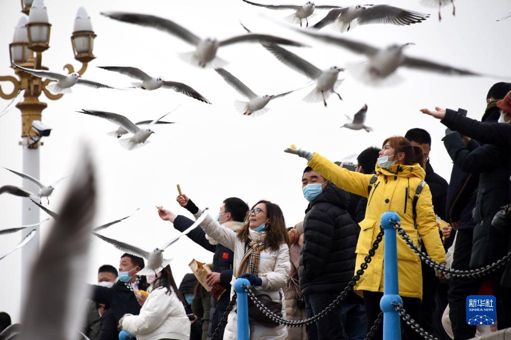 1月26日,游客在青島棧橋景區與海鷗互動(dòng)。