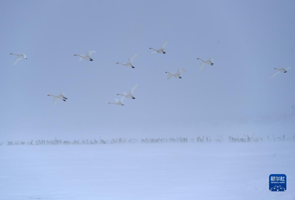 近日,山東榮成出現降雪。在榮成天鵝湖,大天鵝迎風(fēng)戲雪,翩翩起舞。