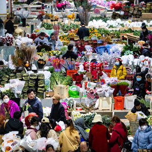 當日是大年初六,位于云南省昆明市的斗南花市內人頭攢動(dòng),人們逛花市、買(mǎi)鮮花,歡度假期。