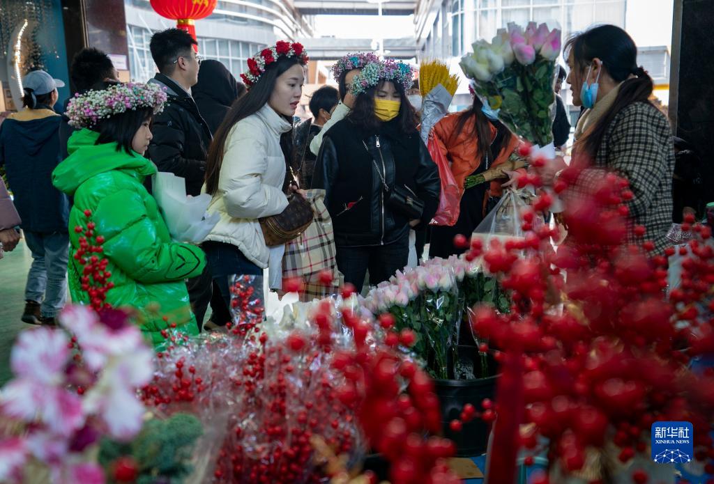 當日是大年初六,位于云南省昆明市的斗南花市內人頭攢動(dòng),人們逛花市、買(mǎi)鮮花,歡度假期。