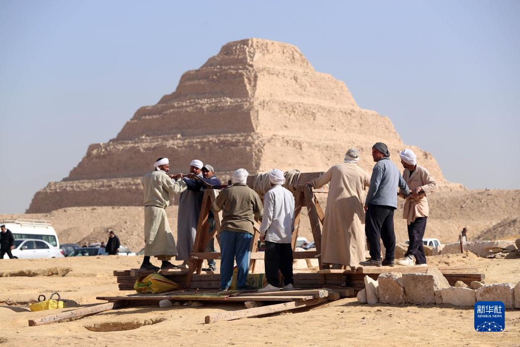 1月26日,在埃及塞加拉地區,工作人員聚集在考古發(fā)掘現場(chǎng)。