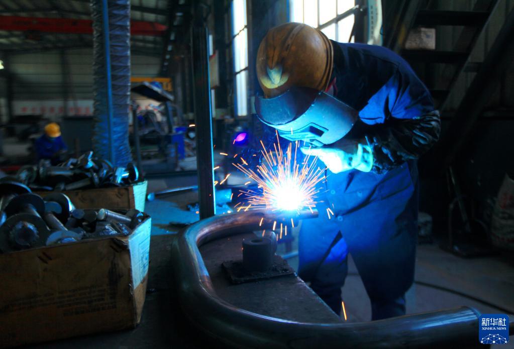 1月28日,工人在山東省臨沂市平邑縣地方鎮一家健身器材生產(chǎn)企業(yè)車(chē)間內焊接鋼材。
