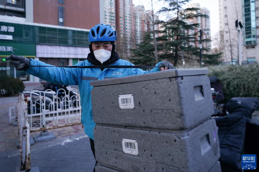 1月28日,在盒馬鮮生北京十里堡店,配送員侯殿彬在打包固定要配送的第一單商品。