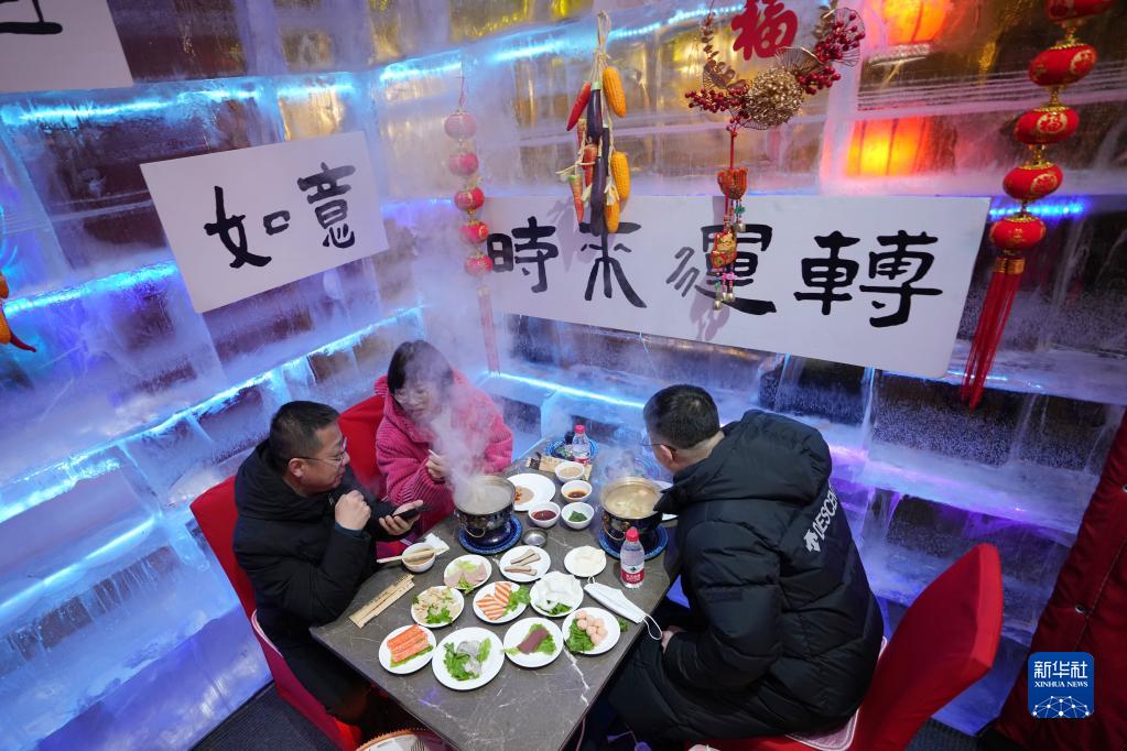 1月28日,游客在哈爾濱中央大街的“冰屋”內品嘗“冰屋火鍋”。