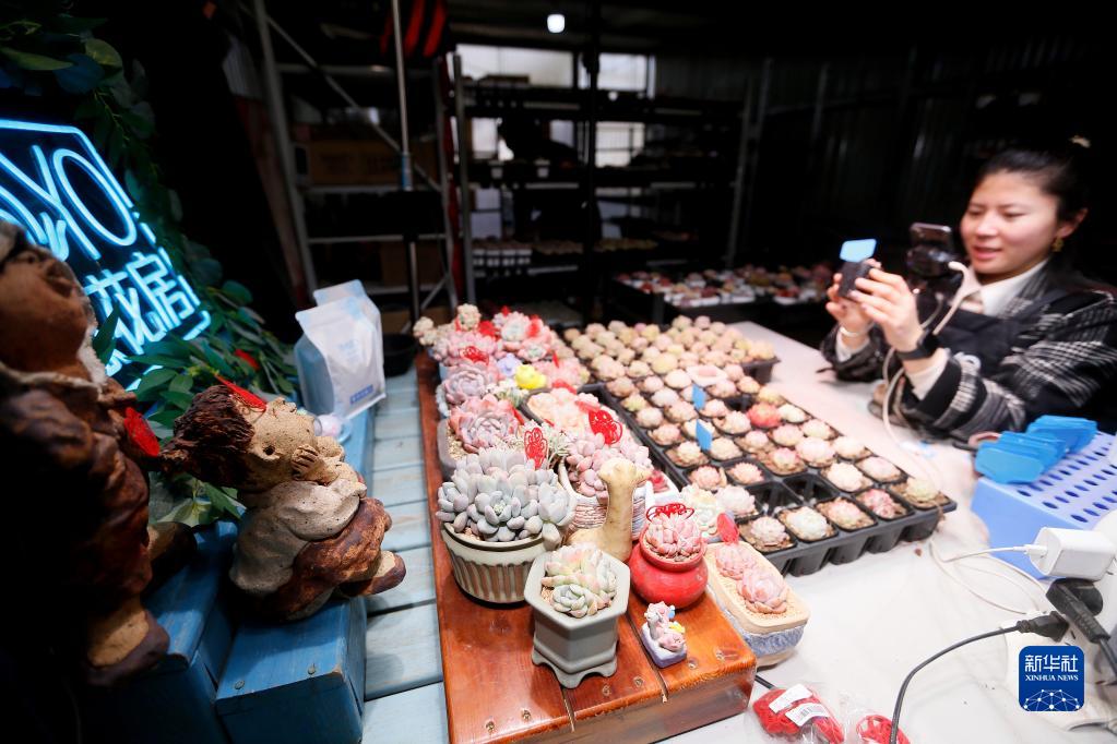 1月29日,在青島市即墨區慢悠花房多肉植物種植基地,一名網(wǎng)絡(luò )主播線(xiàn)上銷(xiāo)售多肉植物。