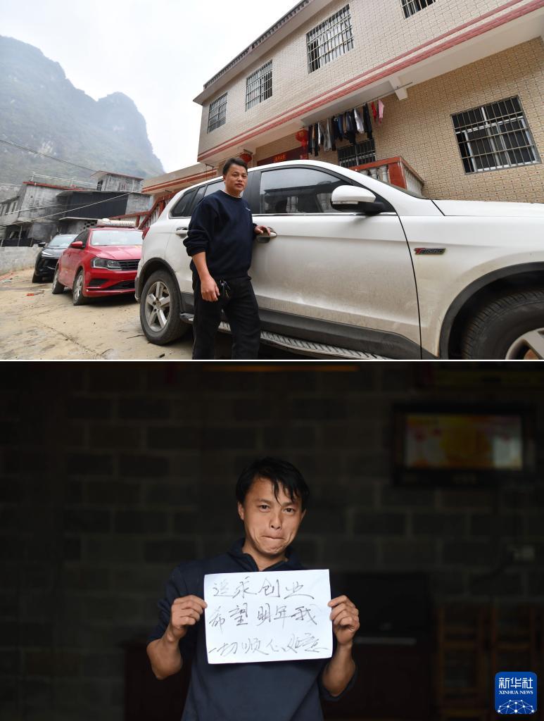 拼版照片:上圖為2023年1月22日,弄勇村弄頂屯村民蒙桂林在自己的房子和汽車(chē)前;下圖為2015年2月14日,蒙桂林寫(xiě)下新年愿望——希望返鄉創(chuàng )業(yè)有收獲。