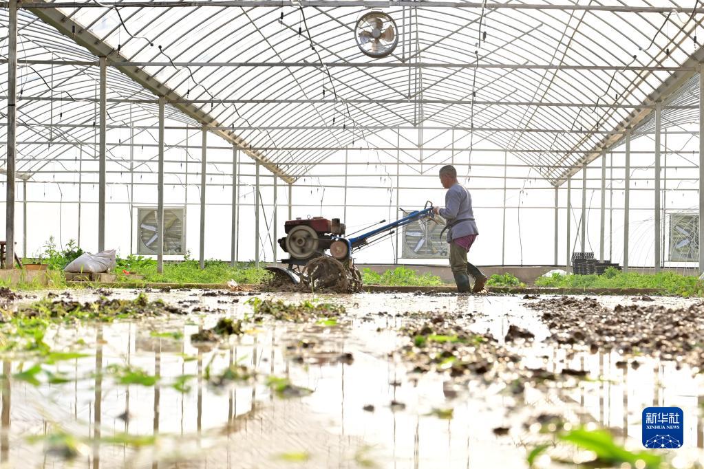 1月29日,在湖南省婁底市雙峰縣青樹(shù)坪鎮歸古新村,農民駕駛農機在大棚內整地。