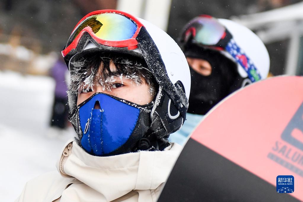在吉林市萬(wàn)科松花湖度假區,一名滑雪愛(ài)好者的頭發(fā)上結滿(mǎn)了冰凌(1月23日攝)。