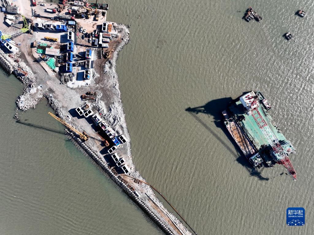 1月29日,在江蘇省連云港市連島國家級中心漁港,大型浮吊在海上作業(yè)(無(wú)人機照片)。