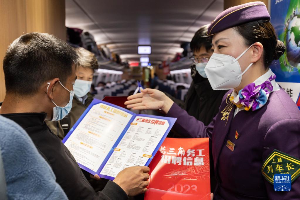 1月30日,在阜陽(yáng)開(kāi)往上海的G7445次列車(chē)上,鐵路上??瓦\段乘務(wù)人員向旅客介紹長(cháng)三角務(wù)工招聘信息。