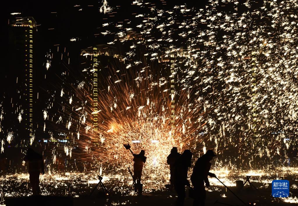 1月29日,藝人在甘肅省臨夏回族自治州永靖縣劉家峽鎮郁金香廣場(chǎng)表演“打鐵花”。