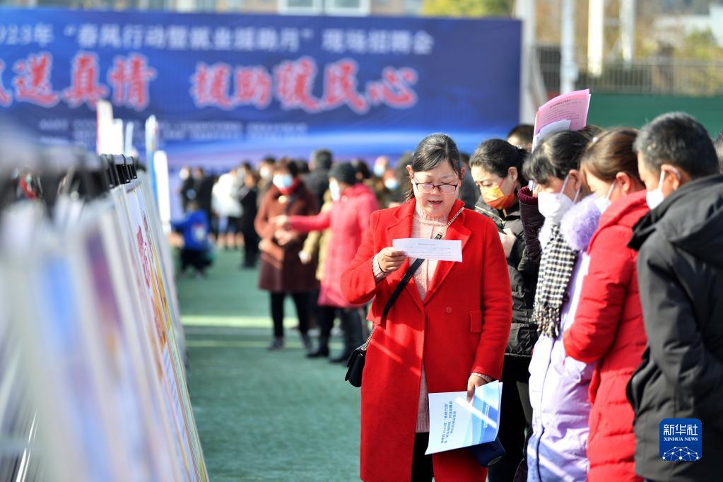 1月31日,求職者在湖北省襄陽(yáng)市??悼h2023年春風(fēng)行動(dòng)暨就業(yè)援助月現場(chǎng)招聘會(huì )上了解崗位信息。