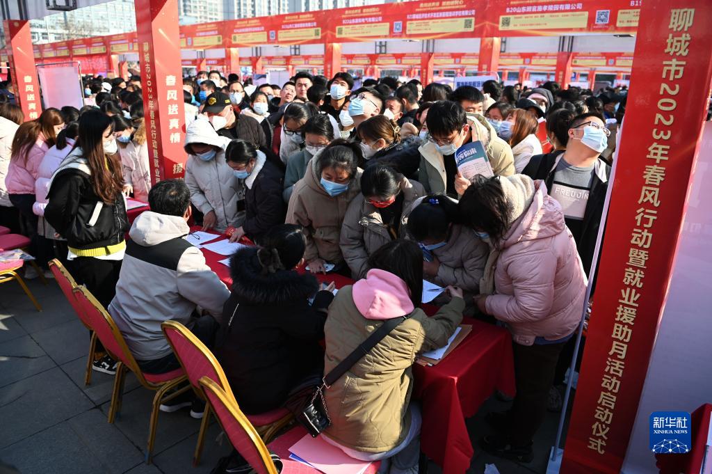 1月31日,在山東省聊城市舉辦的2023年春風(fēng)行動(dòng)暨就業(yè)援助月現場(chǎng)招聘會(huì )上,求職者在應聘。